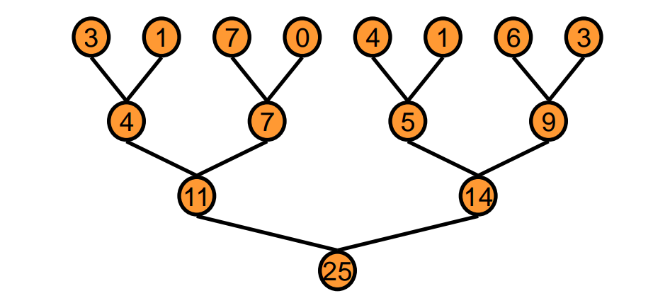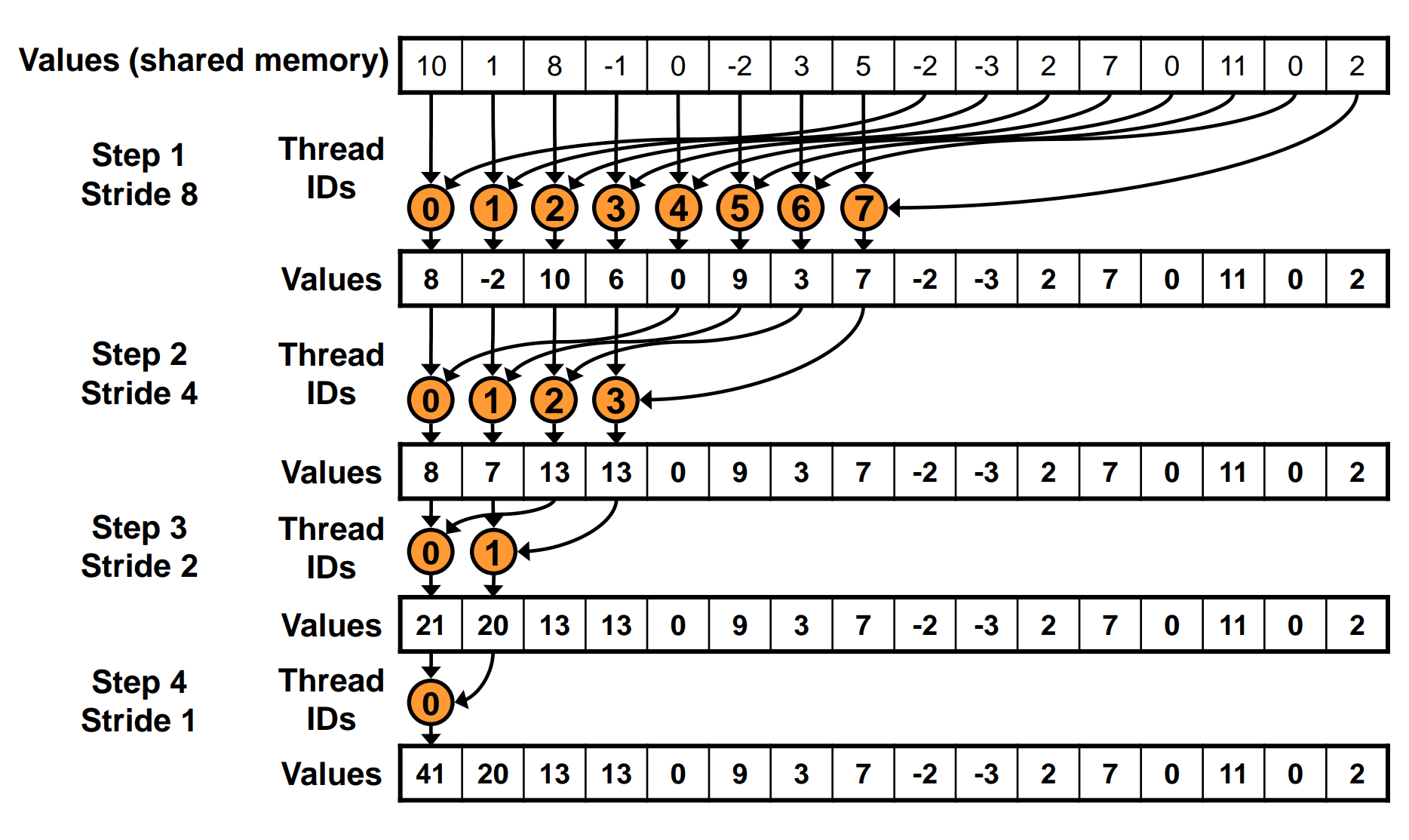 In every iteration, two elements are combined by a thread. After log2(n) iterations, only one element remains, which is the final result. In code implementation, we can use shared memory to store intermediate results and avoid global memory access.
