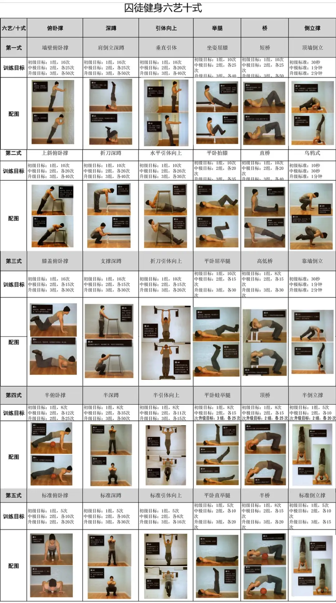 《囚徒健身》中提到了六种锻炼方式,中文翻译为六艺,它们分别是:俯卧撑、引体向上、深蹲、举腿、桥(向后下腰)、倒立撑。这几个动作能够锻炼胸肌、背阔肌、肱二头肌、双腿、腹部等等。健身房、私教课程等,这些都是市场营销策略下的产物。现如今,大街上满是健身房的推广,去健身房后满是私教的推广。而我们不需要健身房中花里胡哨的器械,也不需要所谓的私人教练,不要被这些推广所干扰,我们有更简单有效地增强力量。减肥的方法,那就是利用自重来做无器械训练。