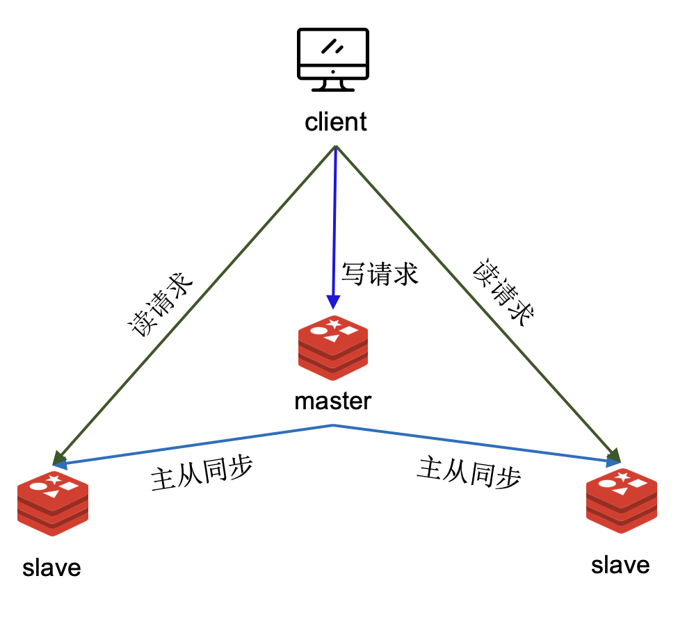 主从模式下,一个 Redis 作为主节点,另外一个或多个 Redis 作为从节点。写入主节点中数据的会源源不断地同步到从节点中,如此以来,从节点上有主节点数据的副本。主节点上可以进行读写操作,从节点只能进行读操作。为了避免给主节点操作太大压力,常常让主节点只处理写请求,从节点上处理读请求。